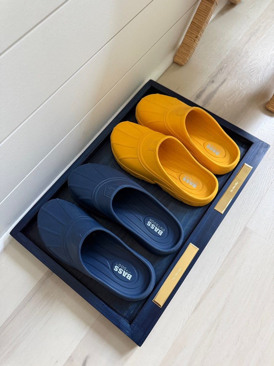 Find a tray that fits your space and your shoes well, and then elevate it with personalized plaques. The key is to make sure the tray fits the shoes just right, not too big, not too small